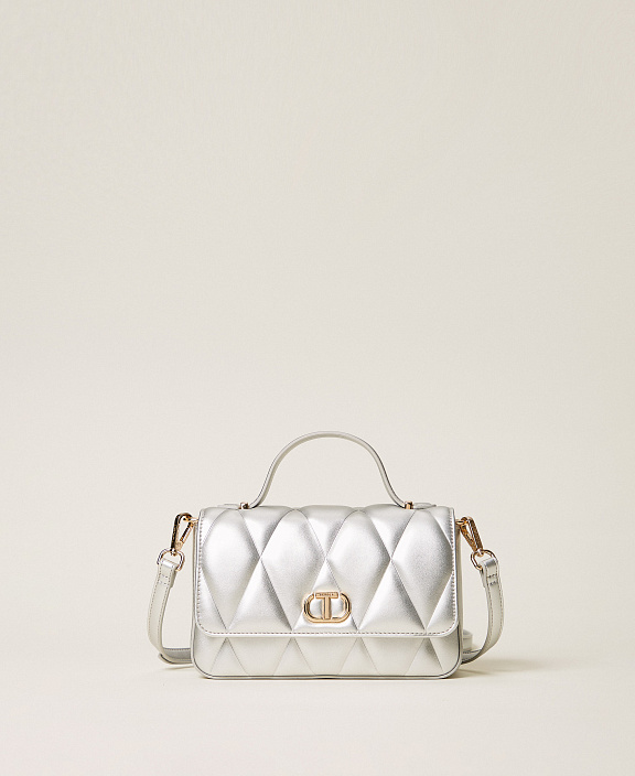 Сумка через плечо с имитацией наппы из телячьей кожи с термозапечатанной отделкой в виде ромбовидной стежки с легкой ватной набивкой внутри. Изделие имеет ручку для ношения в руке, съемный регулируемый плечевой ремень для ношения через плечо или кросс-боди, застежку на клапан и магнит, металлический логотип спереди и подкладку.